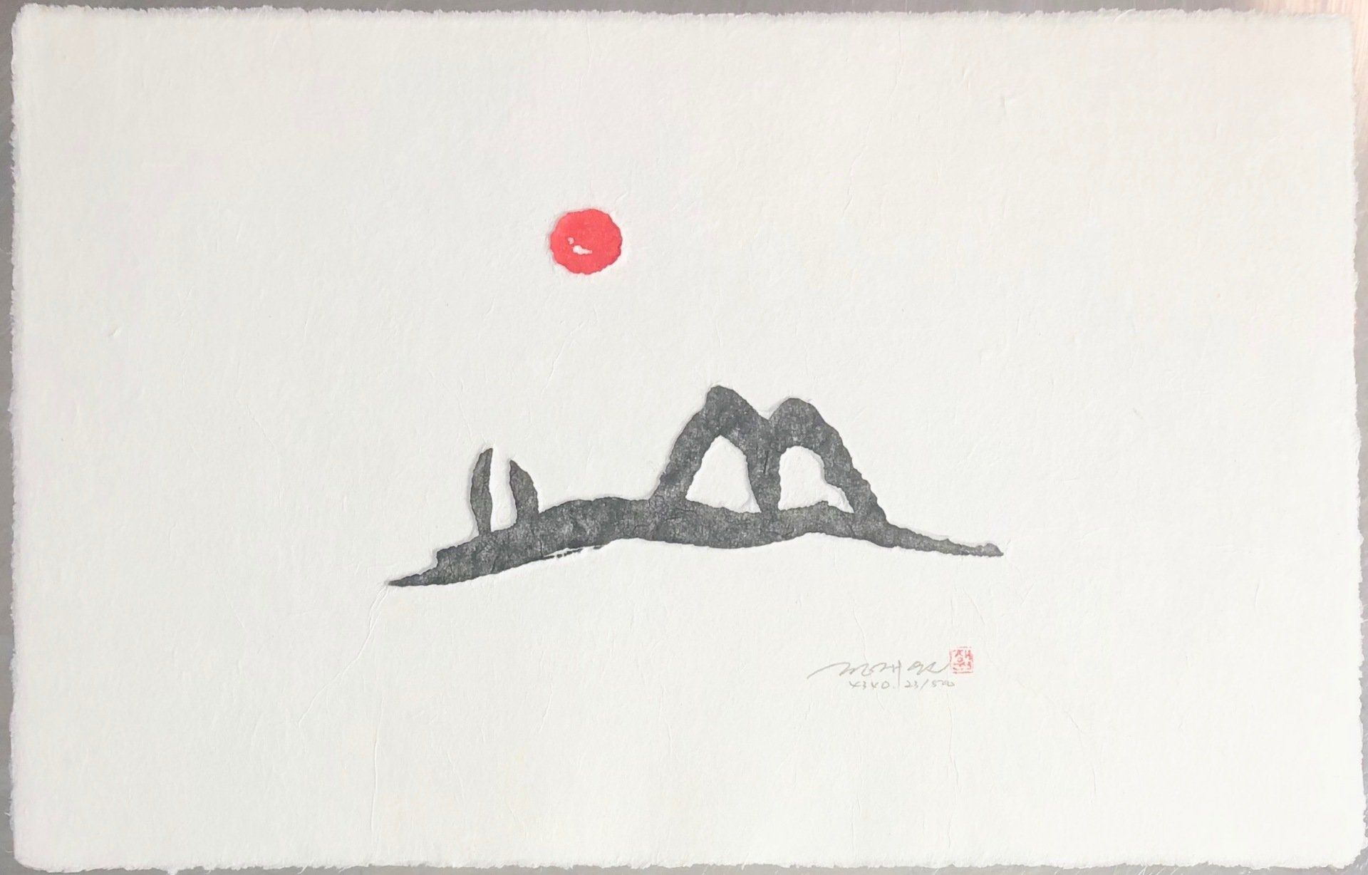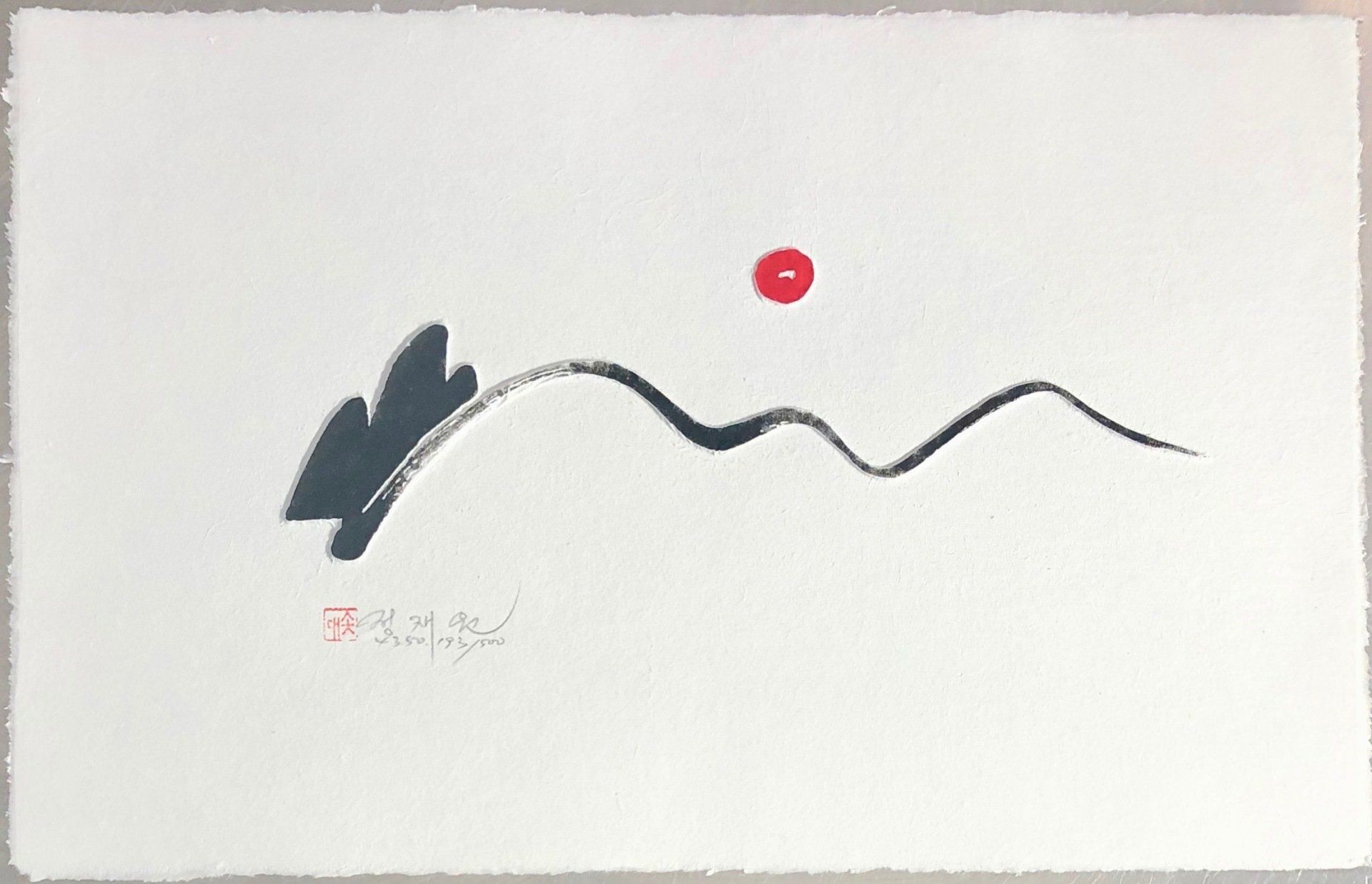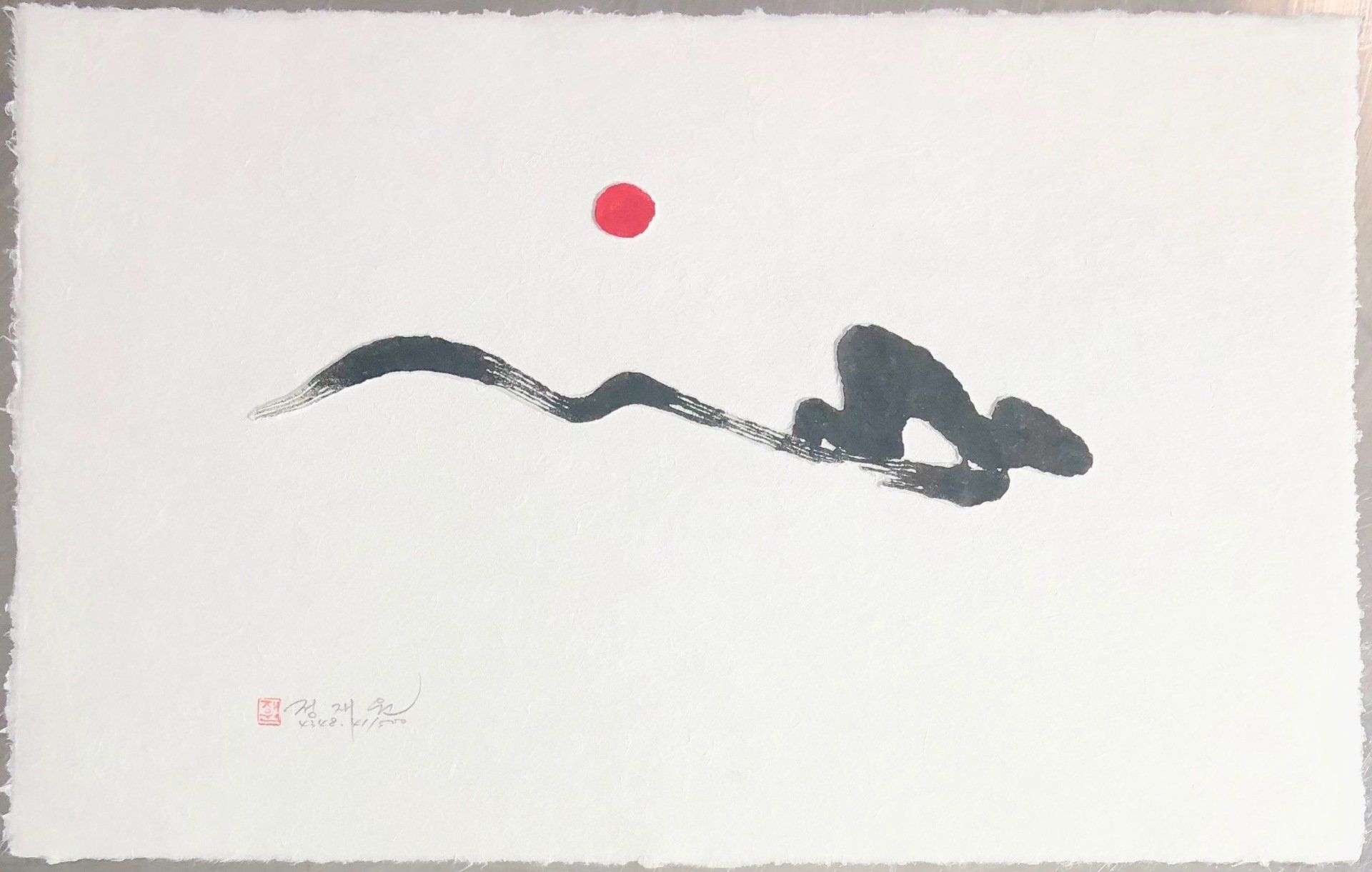 Nichts ist schöner als ein stimmungsvoller Sonnenaufgang über den Bergen. Die Kalligraphie, gezeichnet von rechts nach links, gibt diese lebendige und freundliche Stimmung wieder.