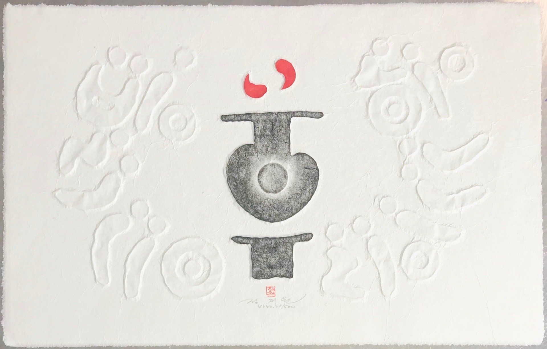 Der heilige Gral steht im Mittelpunkt. In seinem Umfeld leben viele Menschen ein erfülltes Leben, in dem sie Gott anbeten und einander respektieren. Die koreanischen Schriftzeichen symbolisieren die Menschen: 'Bal-Geum-Ha-Nu-Ri' - Grosse heitere Welt.
