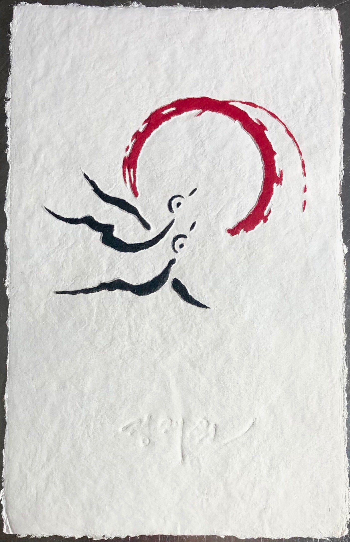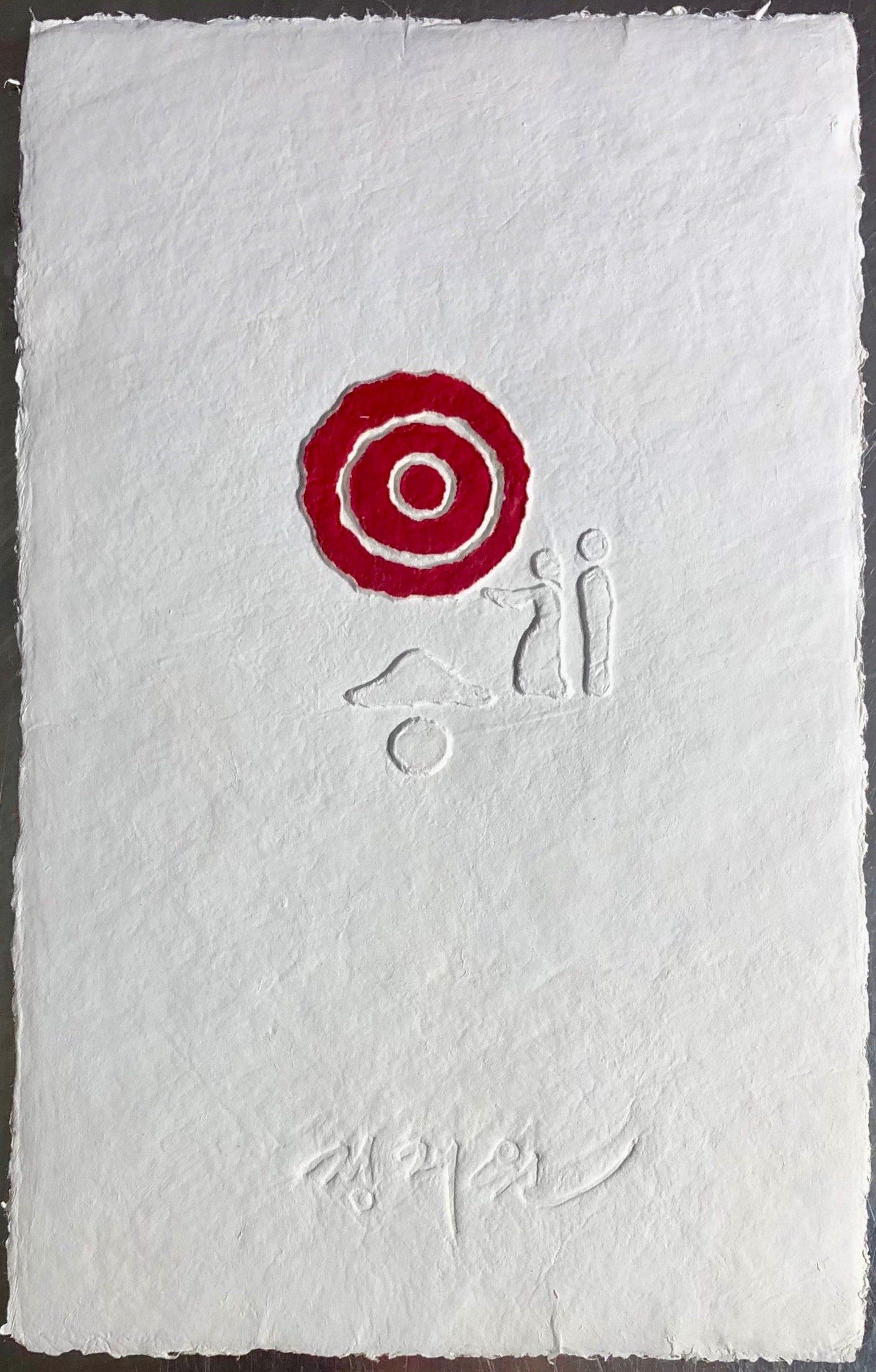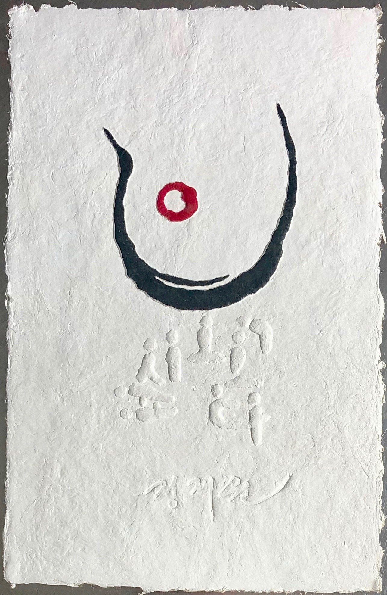 A child smiles - as bright as the sun, as clear as the moon. In the lower part of the picture a bird is sitting on a pole ('Sottae'), which is made up of Korean characters meaning 'Korea'.
