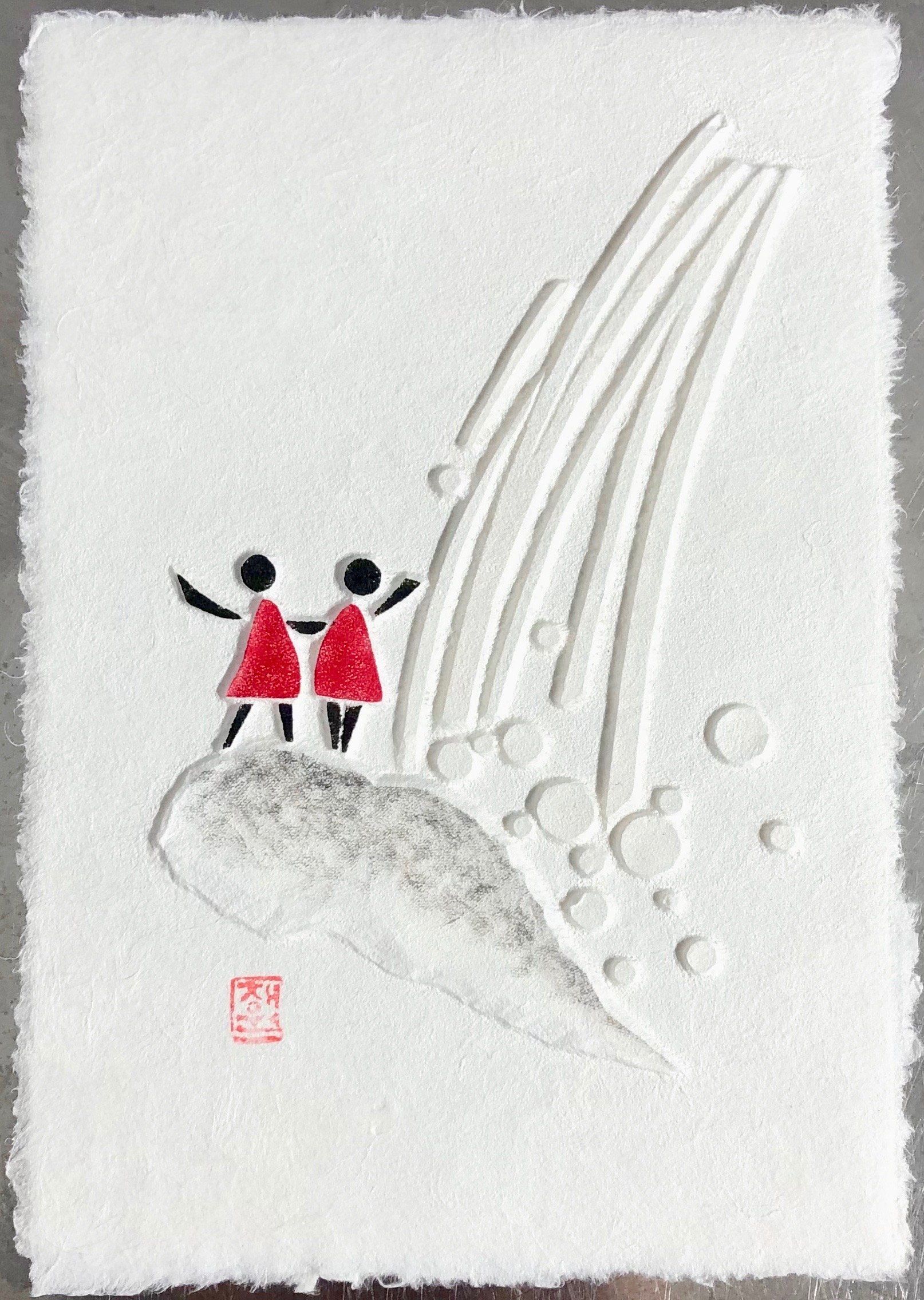 Dieser Takbon zeigt zwei Kinder, die einen Wasserfall beobachten. die Kinder scheinen das Wasser zu mögen. Die runden Wassertropfen zeigen, wie glücklich sie sind.