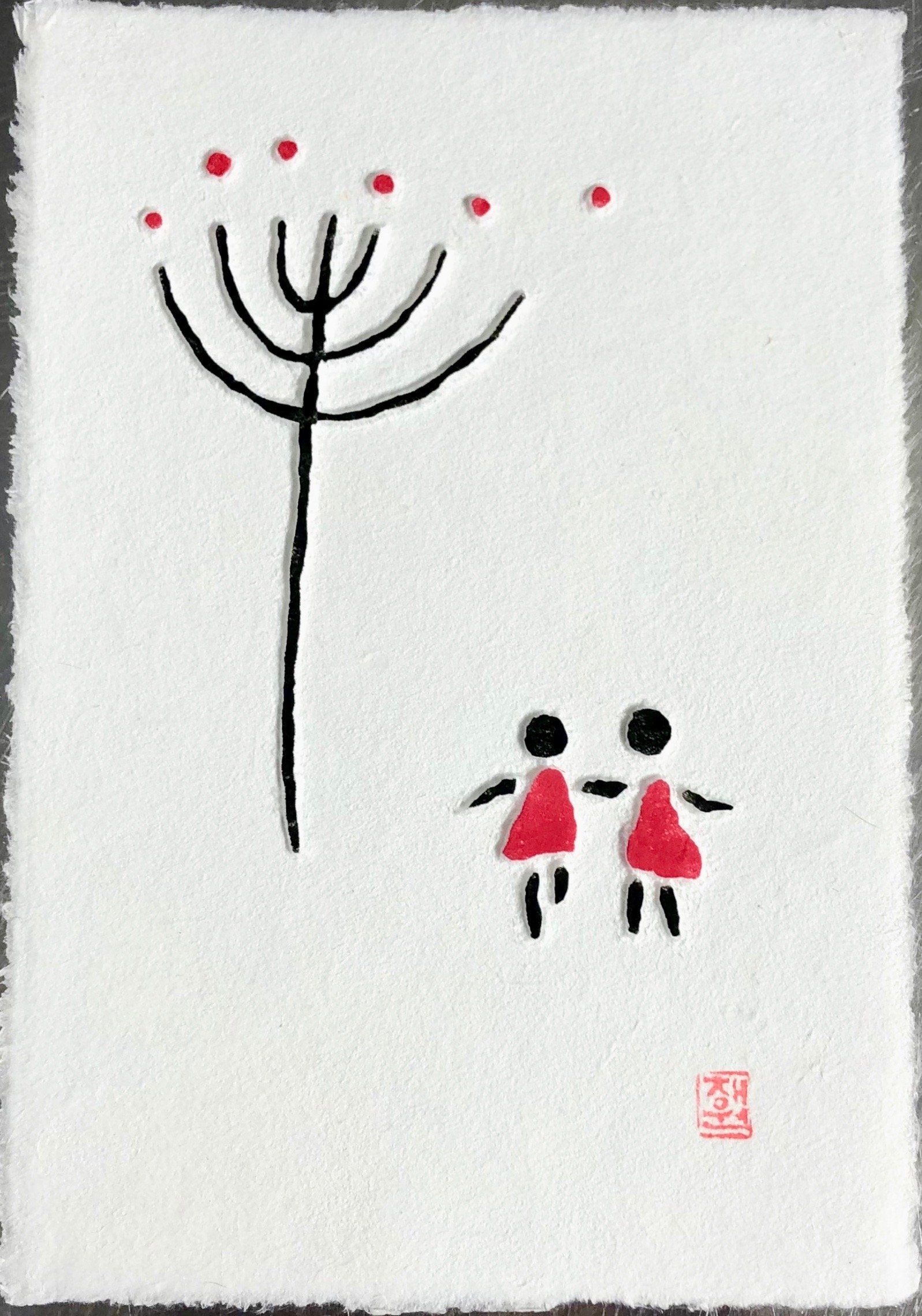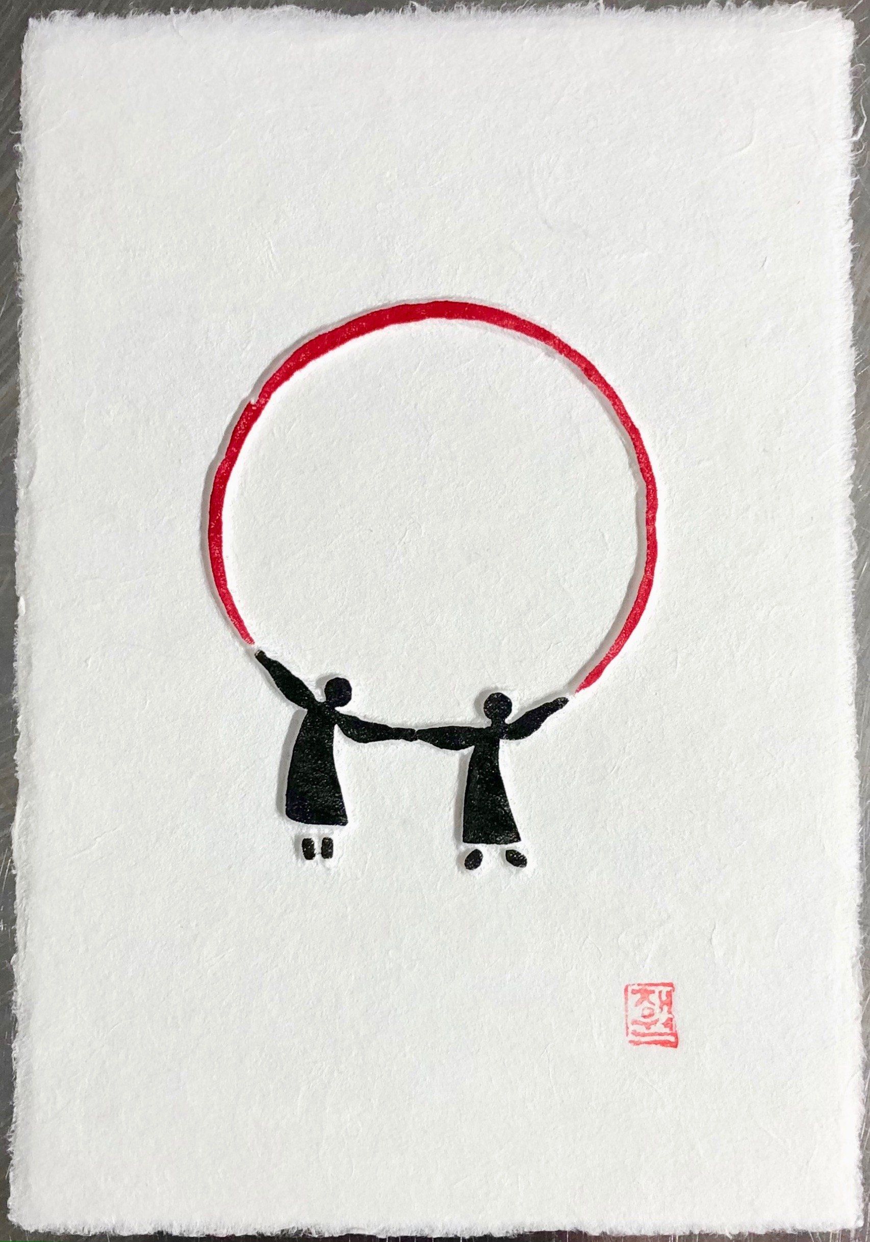 Dieser Takbon zeigt zwei Frauen, die die Sonne umarmen. Die Sonne steht für Hoff-nung und Träume. Das Bild zeigt harmonische glückliche Menschen, die nach ihren Idealen streben.