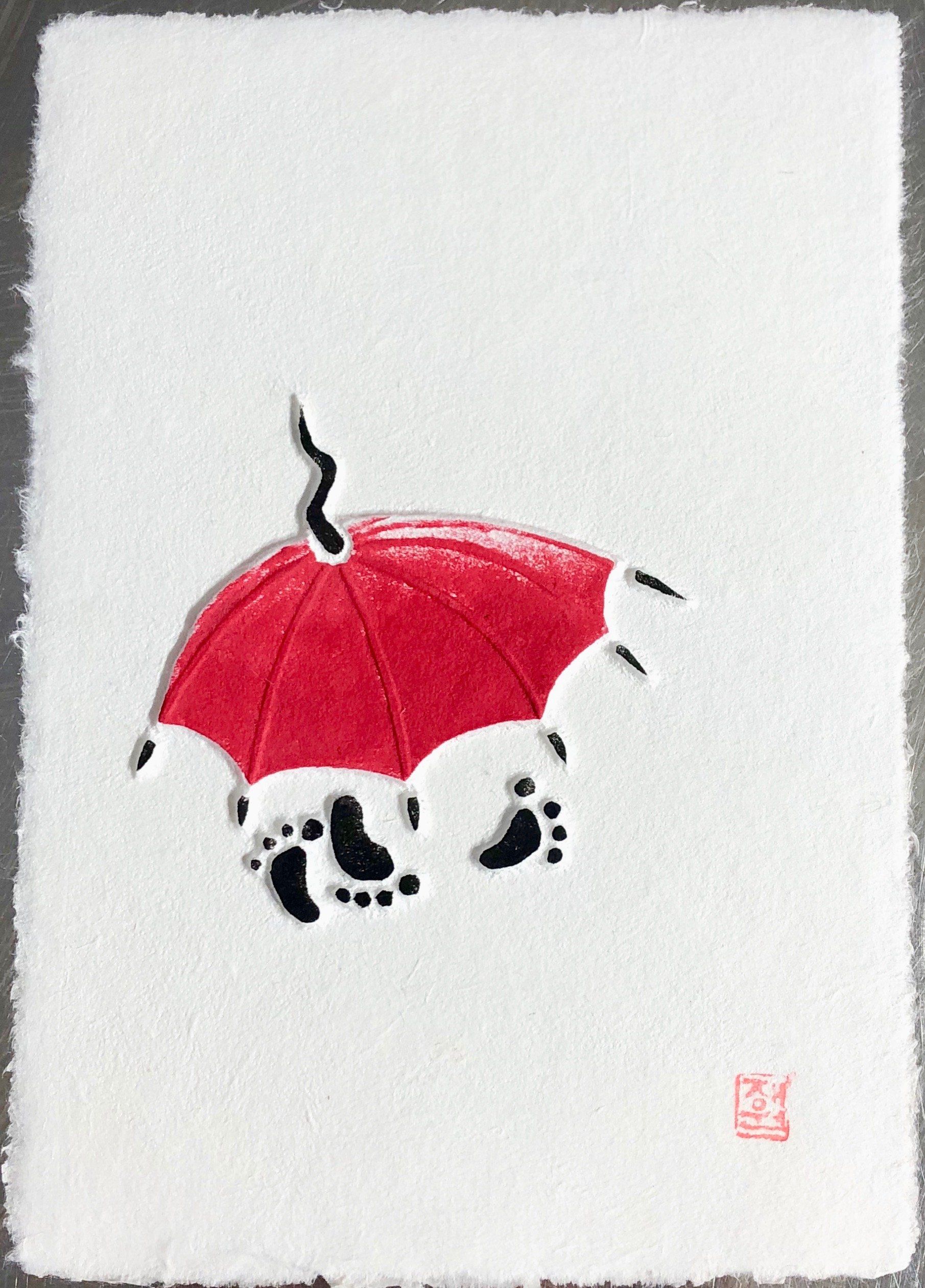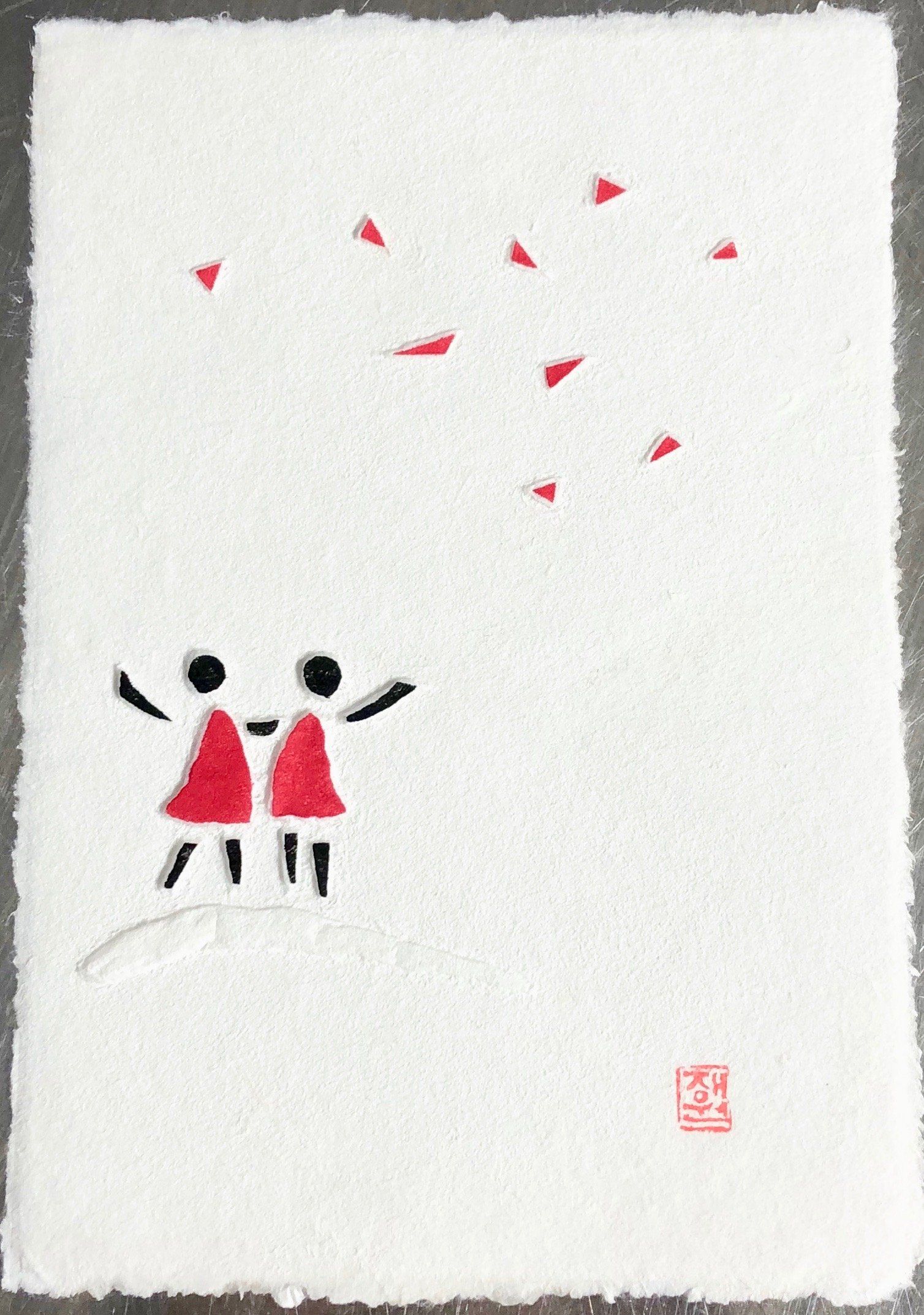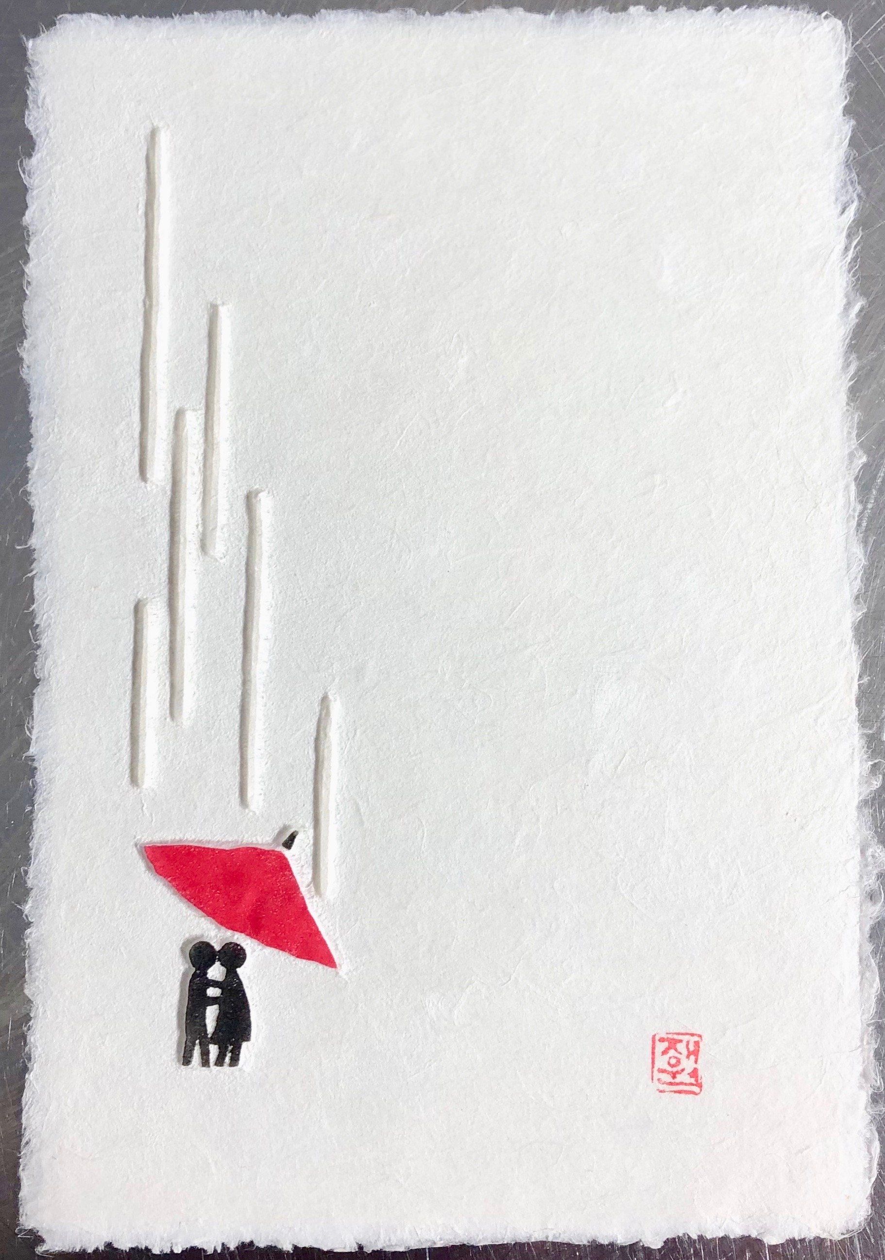 Dieser Takbon zeigt zwei Freunde unter dem Regenschirm. Die Figuren sind auf der linken Seite gezeichnet. So geben sie dem Betrachter viel Freiraum für seine eigene Vorstellungskraft.