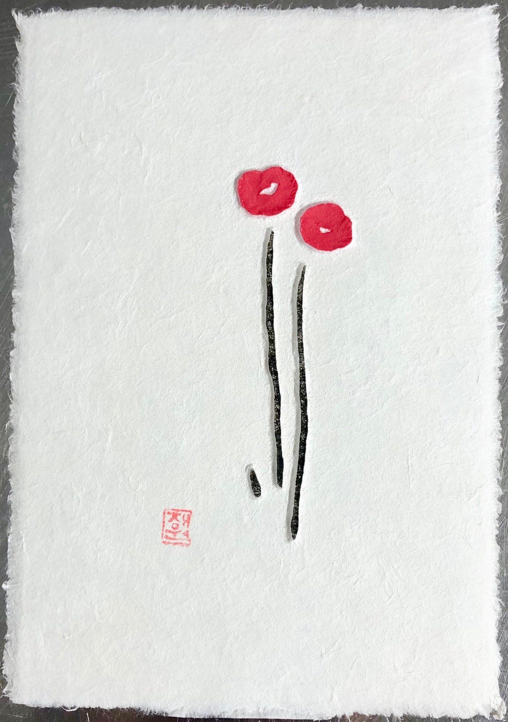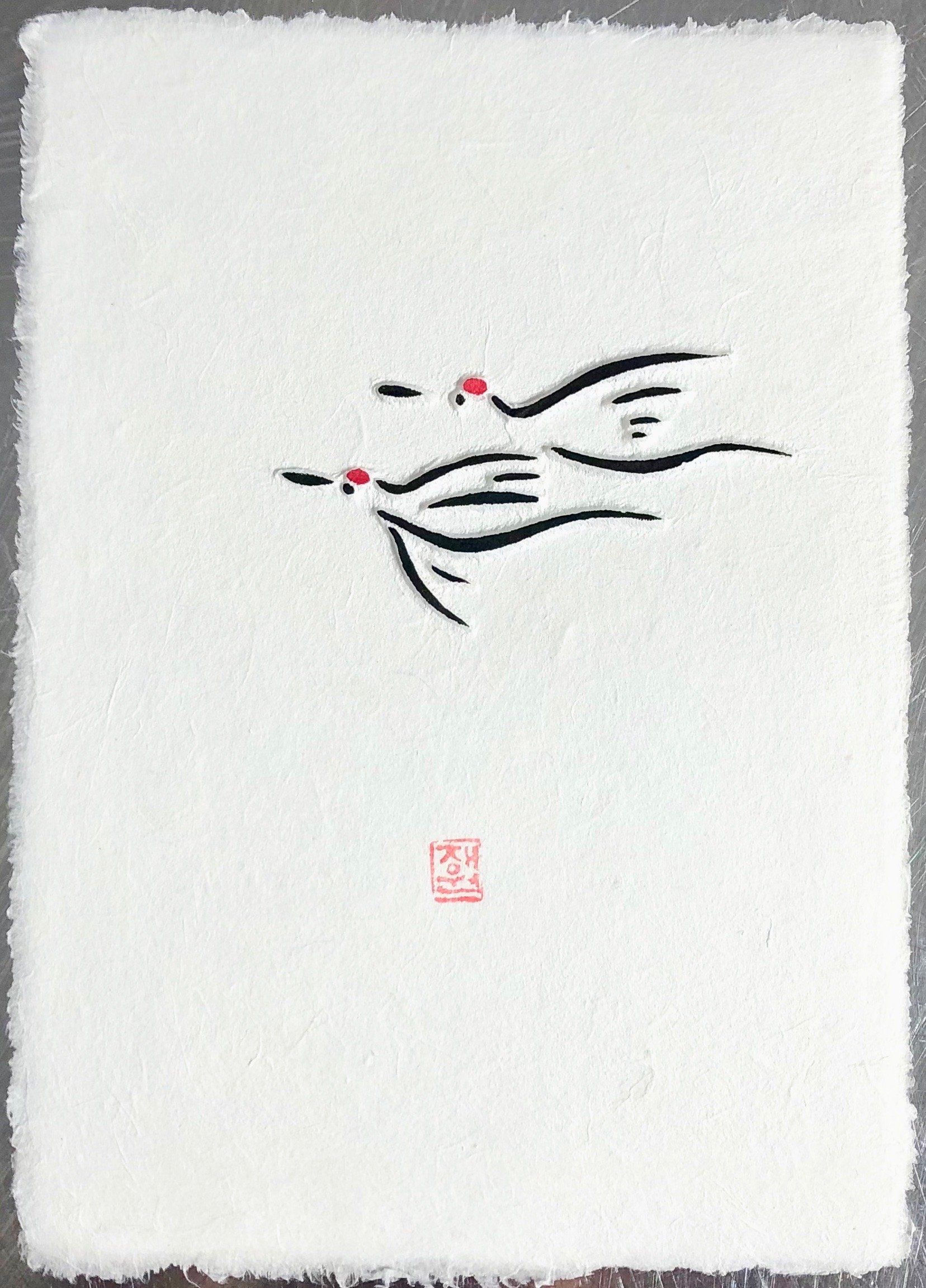Dieser Takbon ist von kalligrafischen Arbeiten abgeleitet. Kraniche symbolisieren Langlebigkeit. Sie wünschen allen, dass sie diese Langlebigkeit friedlich erleben können.