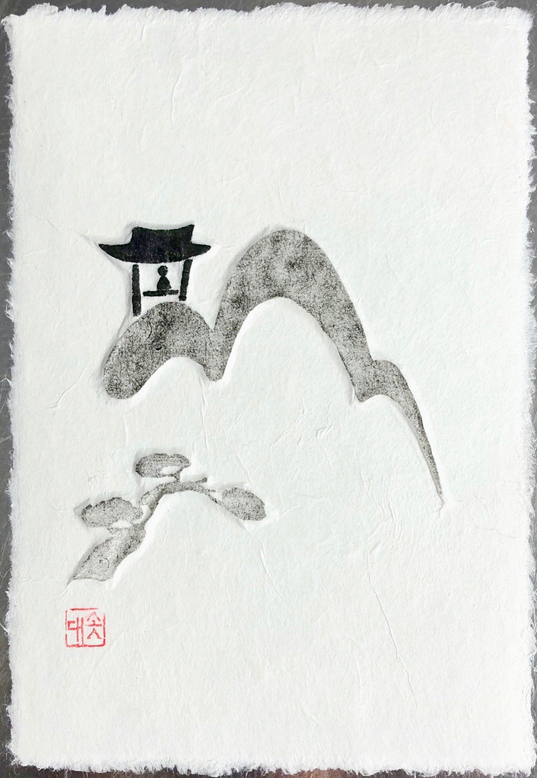 Dieser Takbon zeigt eine Kiefer, einen Berg - als Linie gezeichnet und einen meditierenden Mann. Der Berg scheint sich zu bewegen; der Mann sitzt jedoch still ohne jede Regung.