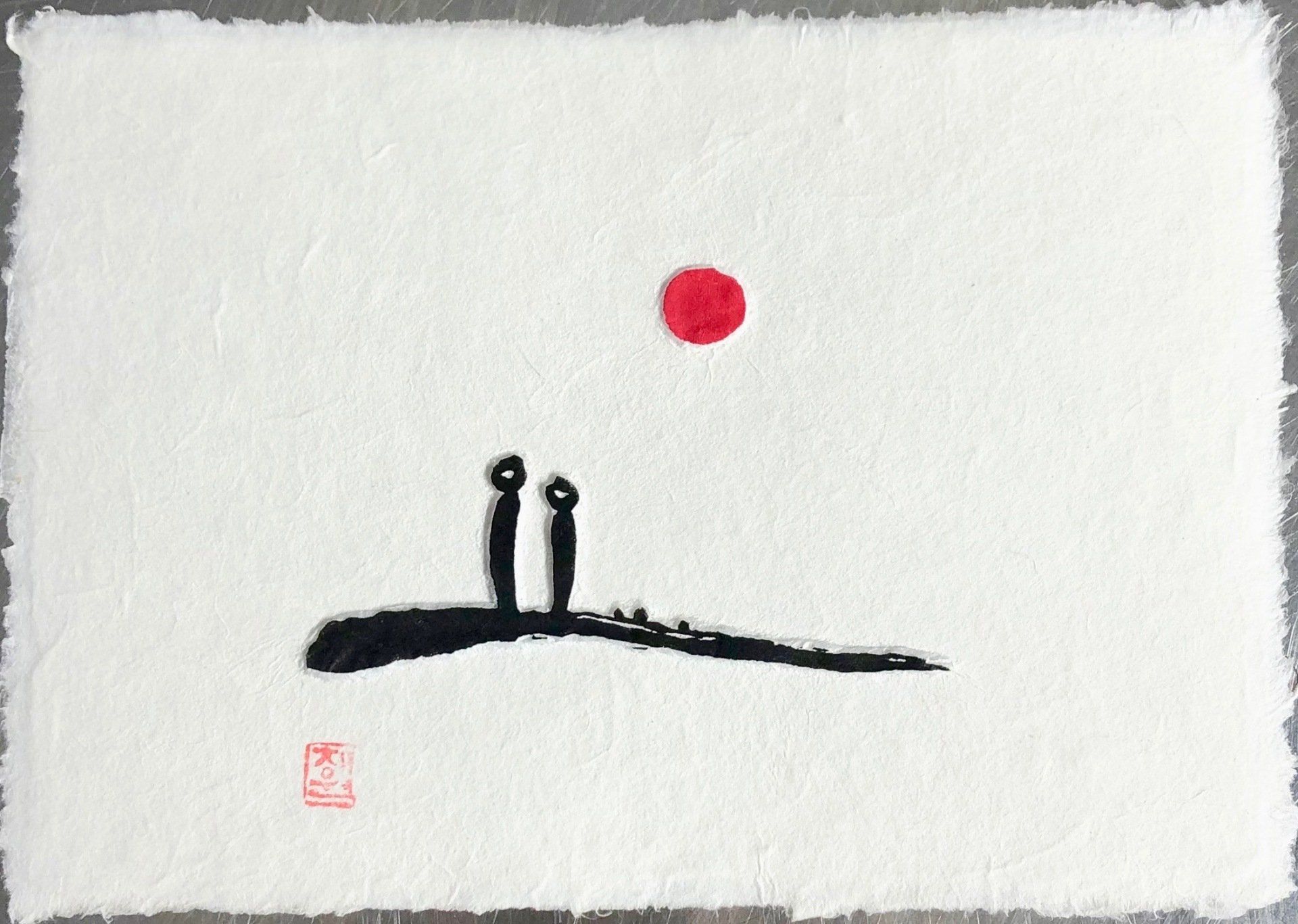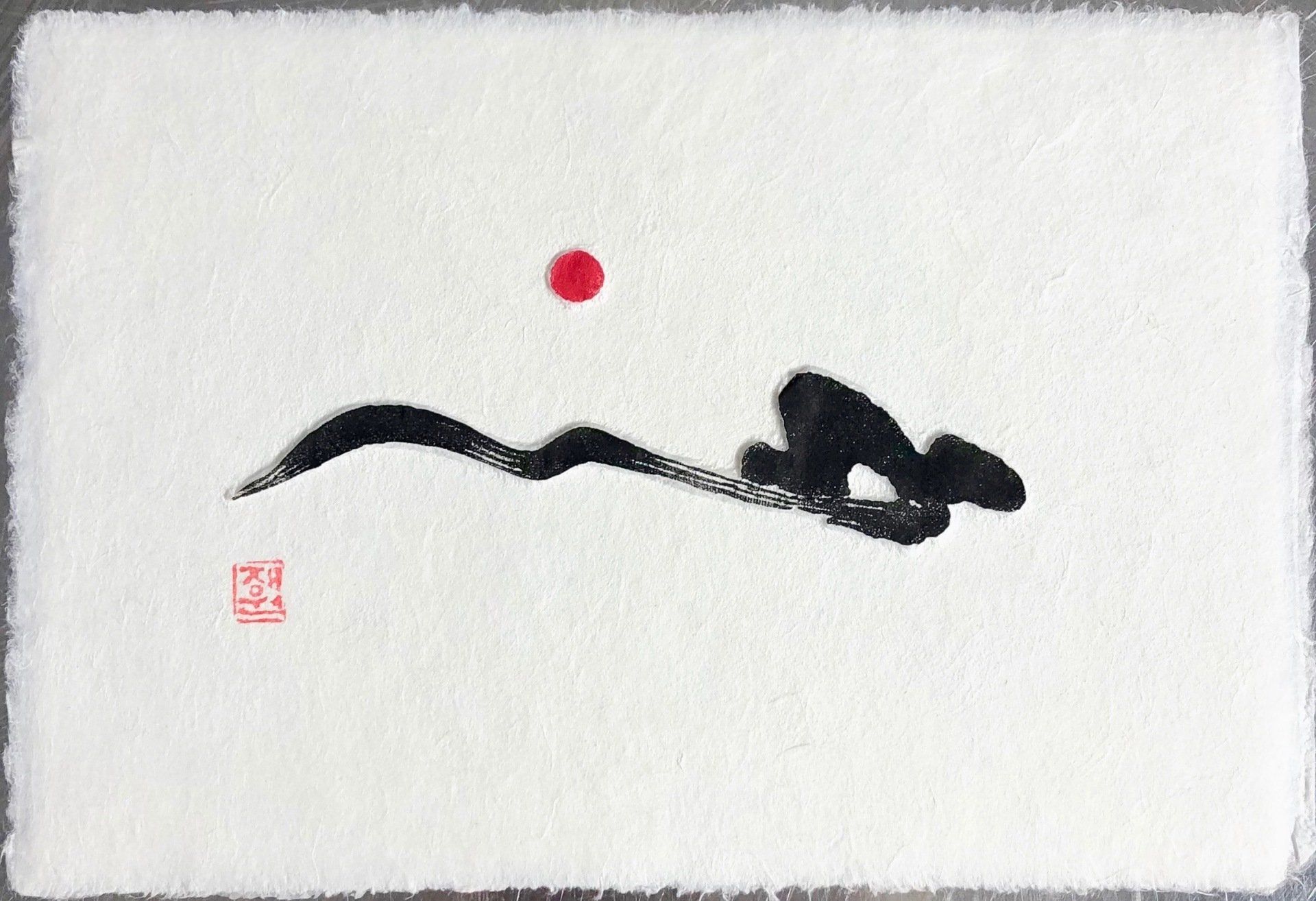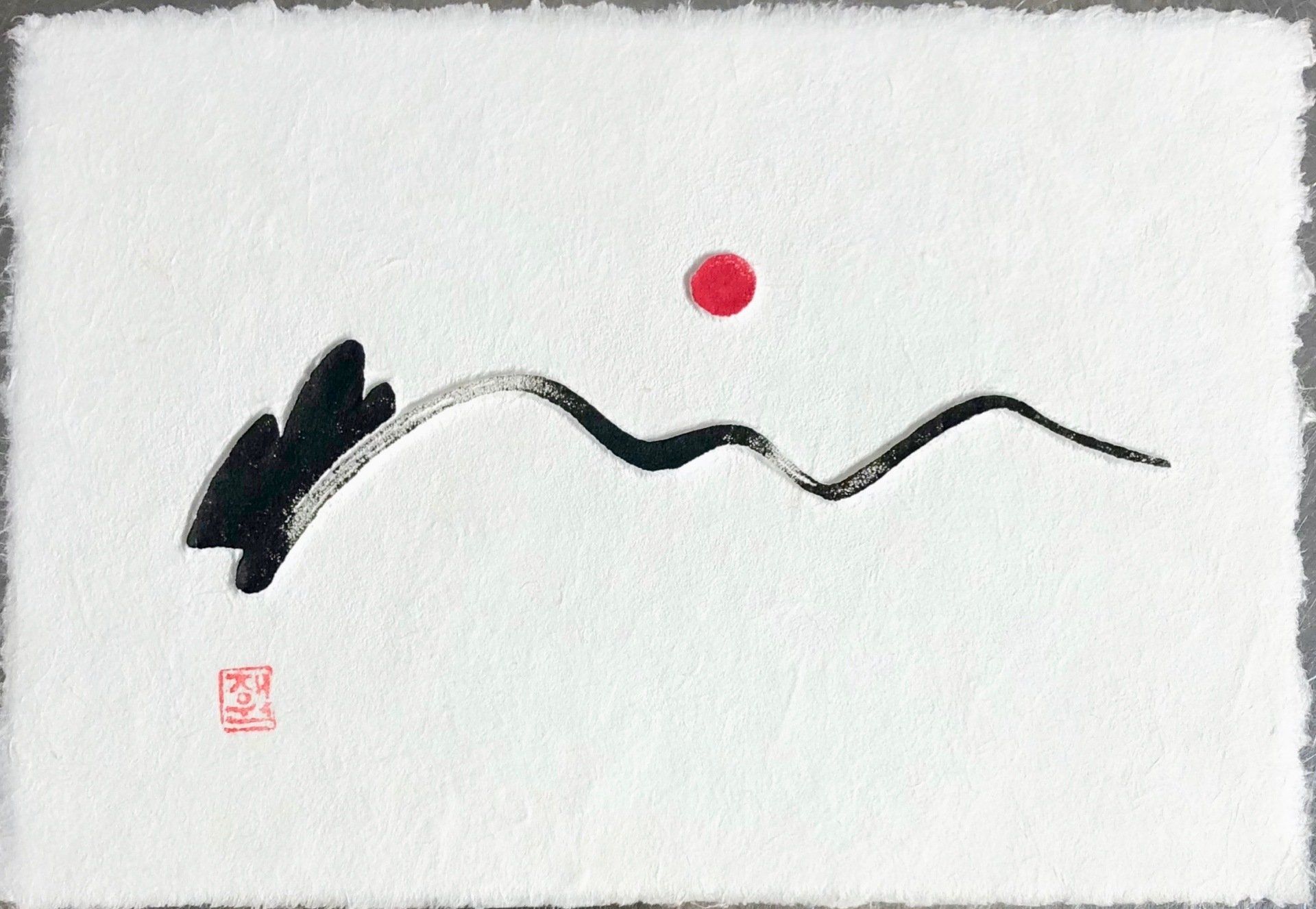 Nichts ist schöner als ein stimmungsvoller Sonnenaufgang über den Bergen. Die Kalligraphie, gezeichnet von rechts nach links, gibt diese lebendige und freundliche Stimmung wieder.